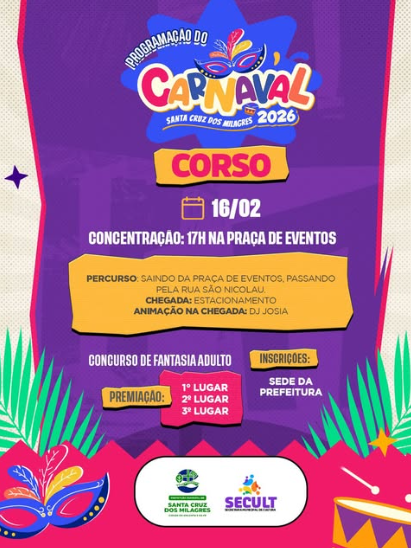 A Prefeitura Municipal de Santa Cruz dos Milagres, por meio da Secretaria Municipal de Cultura (SECULT), convida toda a população para participar do Corso de Carnaval 2026, um dos momentos mais tradicionais e aguardados da programação carnavalesca do município.