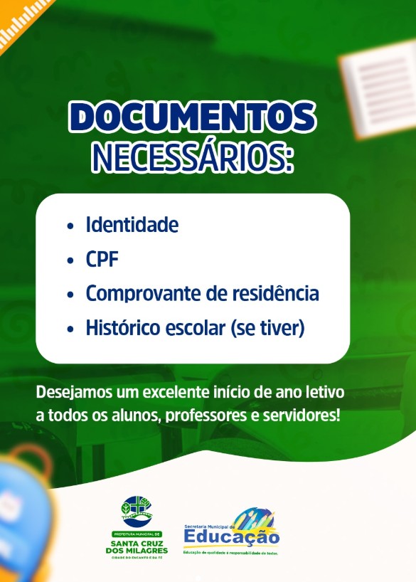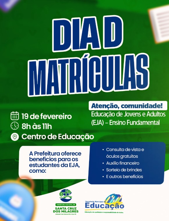 A Prefeitura Municipal de Santa Cruz dos Milagres, por meio da Secretaria Municipal de Educação de Santa Cruz dos Milagres, convida toda a comunidade para participar do Dia D de Matrículas da Educação de Jovens e Adultos (EJA) – Ensino Fundamental.