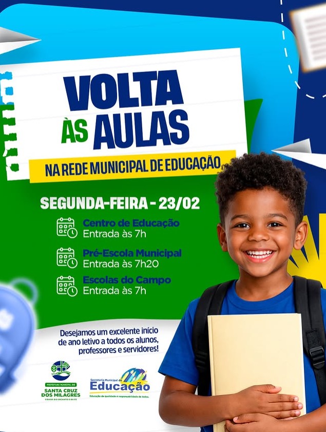 A Prefeitura Municipal de Santa Cruz dos Milagres dá as boas-vindas a todos os alunos, professores e profissionais da Rede Municipal de Educação para o início de mais um ano letivo repleto de oportunidades, aprendizado e crescimento.