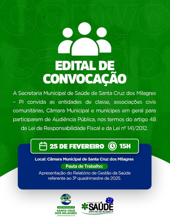A Secretaria Municipal de Saúde de Santa Cruz dos Milagres realizará, no dia 25 de fevereiro, às 15h, Audiência Pública para apresentação do Relatório de Gestão da Saúde referente ao 3º quadrimestre de 2025.