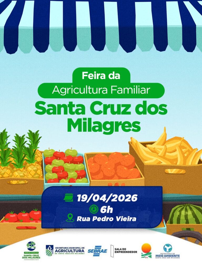 A Prefeitura Municipal de Santa Cruz dos Milagres convida toda a população para participar da Feira da Agricultura Familiar, um momento dedicado à valorização dos produtores locais e ao fortalecimento da economia do município.