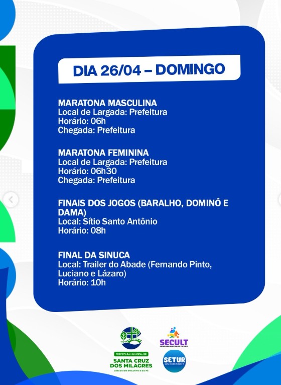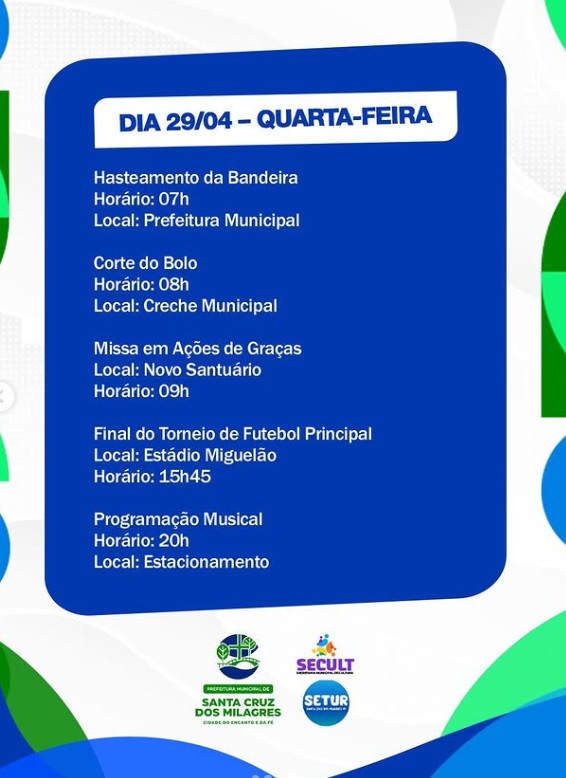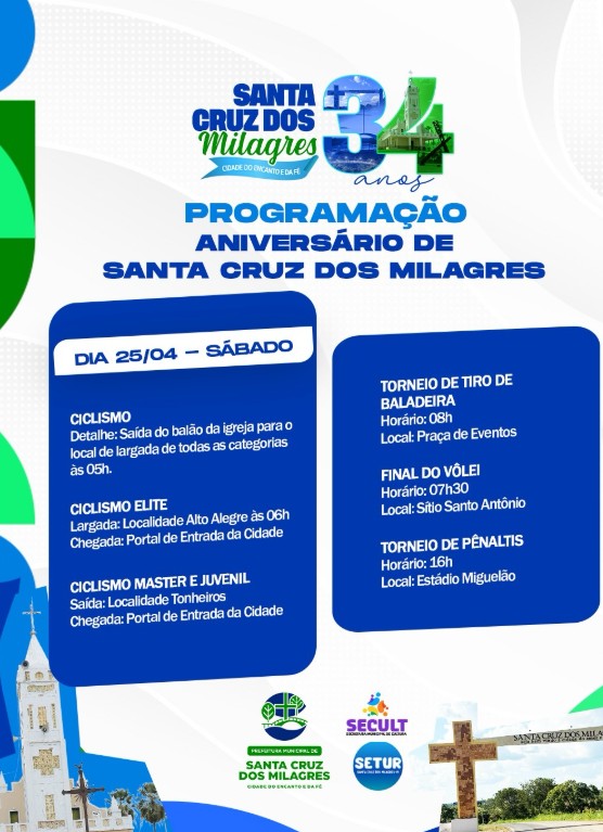 A Prefeitura de Santa Cruz dos Milagres preparou uma programação especial, pensada com muito carinho para abraçar toda a nossa gente e celebrar mais um ano de história do nosso município.